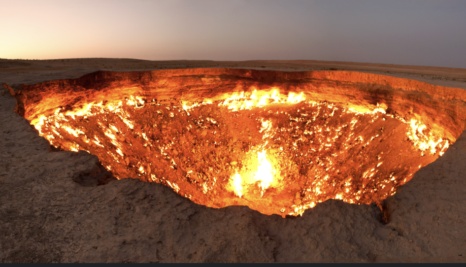 Наричан „Вратата към ада“, този кратер гори вече повече от 50 години. Според официалната версия, през 1971 г. съветски геолози, търсейки нефт, откриват природен газ и го запалват, за да предотвратят разпространение на метан. Огнената дупка е невероятна гледка в пустинята, въпреки трудния достъп до Туркменистан.