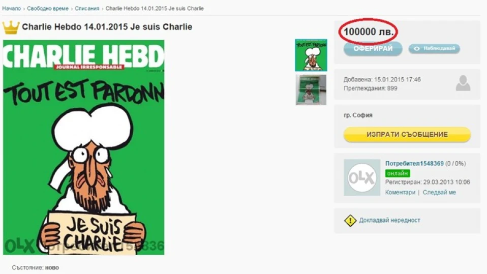 Български сайт за безплатни обяви пусна за продан новия брой на френското списание "Шарли Ебдо", който излиза след терористичното нападение над редакцията, срещу шокиращата сума от 100 000 лева.