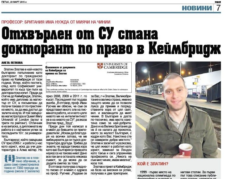 Сто хиляди прочитания за няма и 24 часа! Това изумително постижение регистрира материалът "Отхвърлен от СУ стана докторант по право в Кембрийдж" след публикуването си на сайта trud.bg.