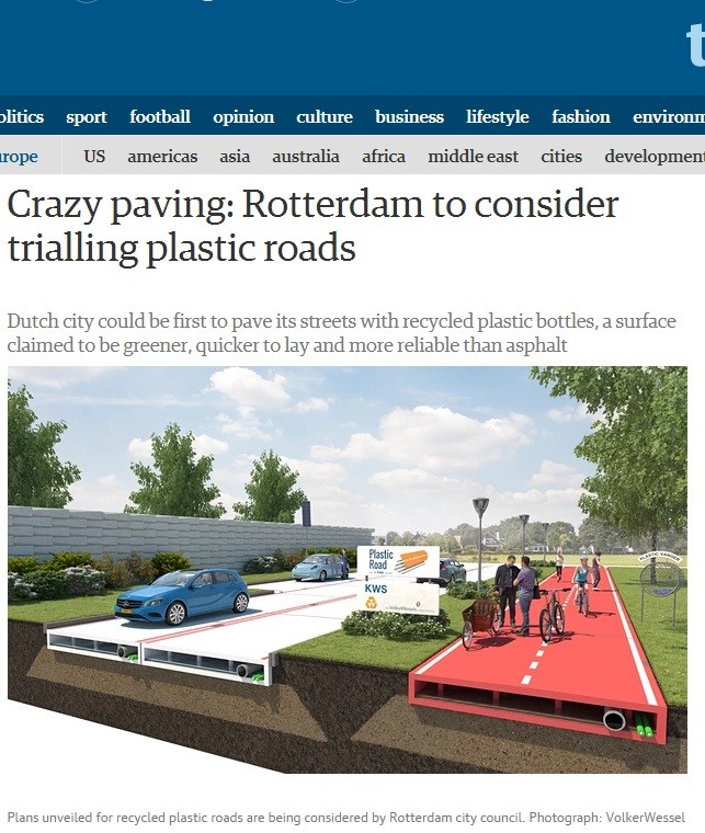 Градският съвет на Ротердам обяви, че обмисля пилотен проект за изграждането на пътна настилка от пластмасови бутилки, с които да се замени асфалтът. Според създателите на продукта от фирмата VolkerWessels рециклираната пластмаса се поддържа по-лесно и може да издържа на по-големи температурни амплитуди - между -40°С и 80°С. Освен това пластмасовите пътища са по-лесни за инсталиране на кабели и тръби.