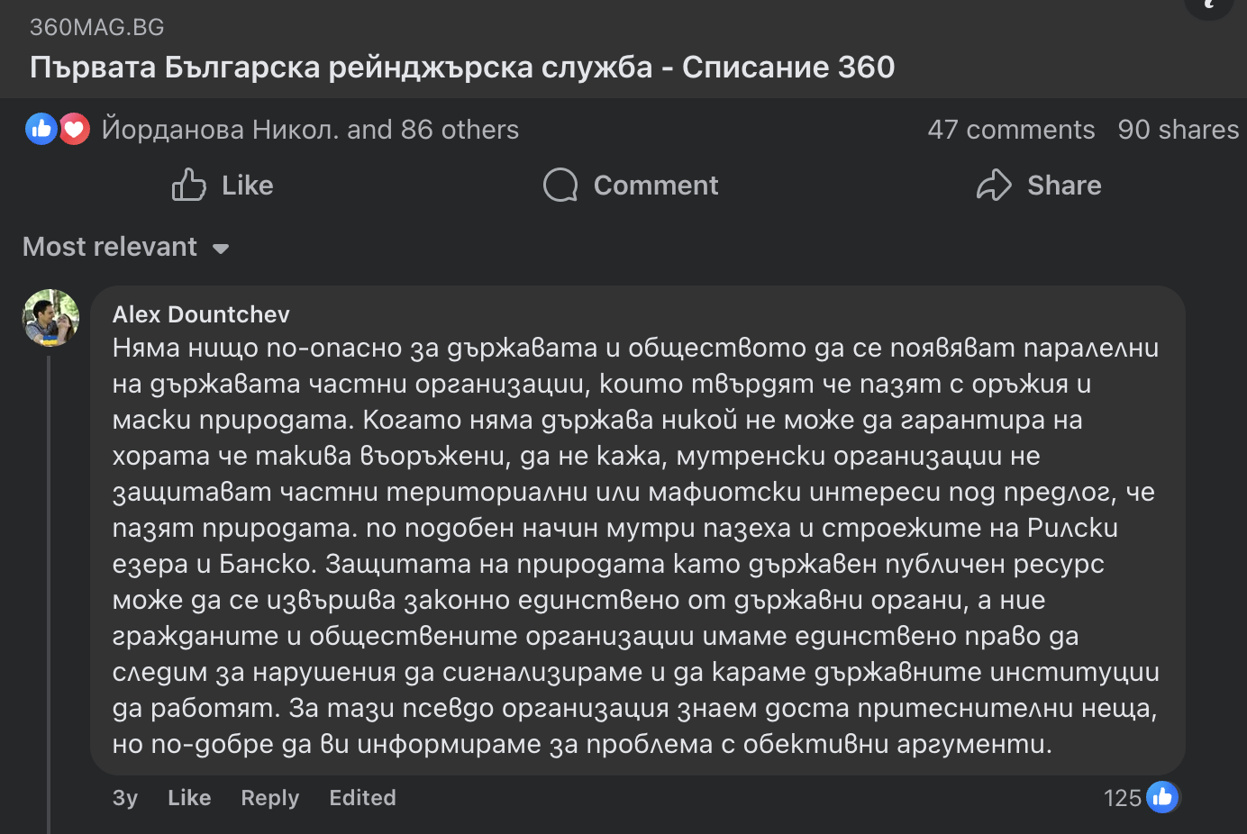 Когато няма държава никой не може да гарантира на хората че такива въоръжени, да не кажа, мутренски организации не защитават частни териториални или мафиотски интереси под предлог, че пазят природата. по подобен начин мутри пазеха и строежите на Рилски езера и Банско. Защитата на природата като държавен публичен ресурс може да се извършва законно единствено от държавни органи, а ние гражданите и обществените организации имаме единствено право да следим за нарушения да сигнализираме и да караме държавните институции да работят.