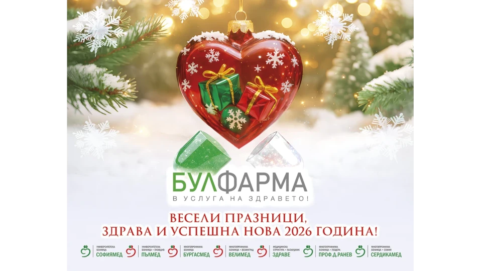 Екипът на БУЛФАРМА и болниците в групата й - УМБАЛ „Софиямед“ и МБАЛ „Сердикамед“ - гр. София, УМБАЛ „Пълмед“ - гр. Пловдив, МБАЛ „Бургасмед“ - гр. Бургас, МС „Здраве“ - гр. Пазарджик, МБАЛ „Велимед“- гр. Велинград и МБАЛ „Проф. Д. Ранев“ - гр. Пещера поздравява всички свои служители, работещи във фирмите от групата, персоналът в лечебните й заведения и техните пациенти, настоящи партньори и приятели с настъпването на коледните и новогодишни празници.