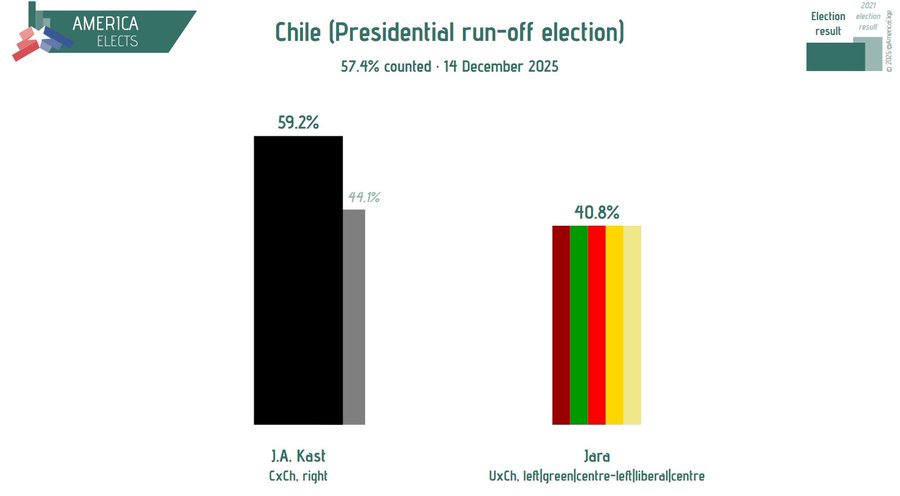 Каст спечели убедителни 58% от гласовете във втория тур срещу подкрепяната от правителството лява кандидатка Жанет Джара, която спечели 42% и бързо призна поражението си.