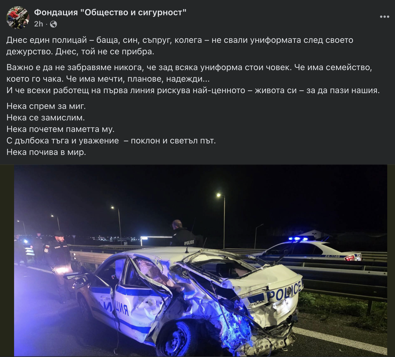 Днес един полицай – баща, син, съпруг, колега – не свали униформата след своето дежурство. Днес, той не се прибра. Това написаха в социалните мрежи от Фондация "Общество и сигурност".