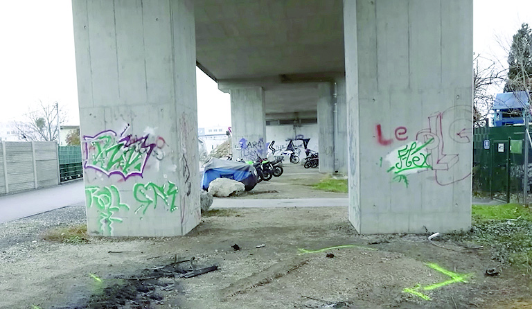 Автомобилът е бил опожарен под колоните на този мост във виенския квартал "Донаущат". Следите от стихията се виждат на снимката от австрийското издания "Кронос".