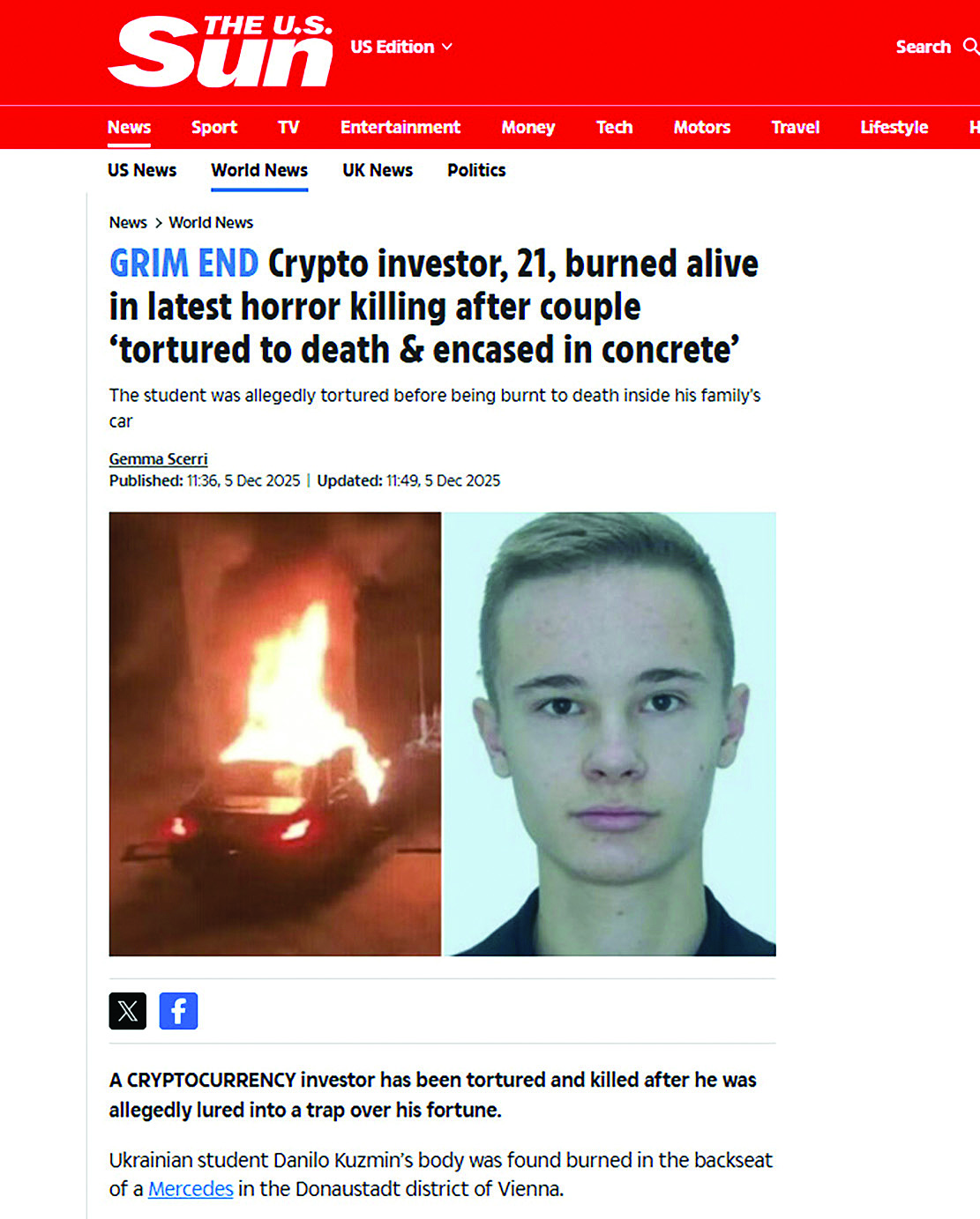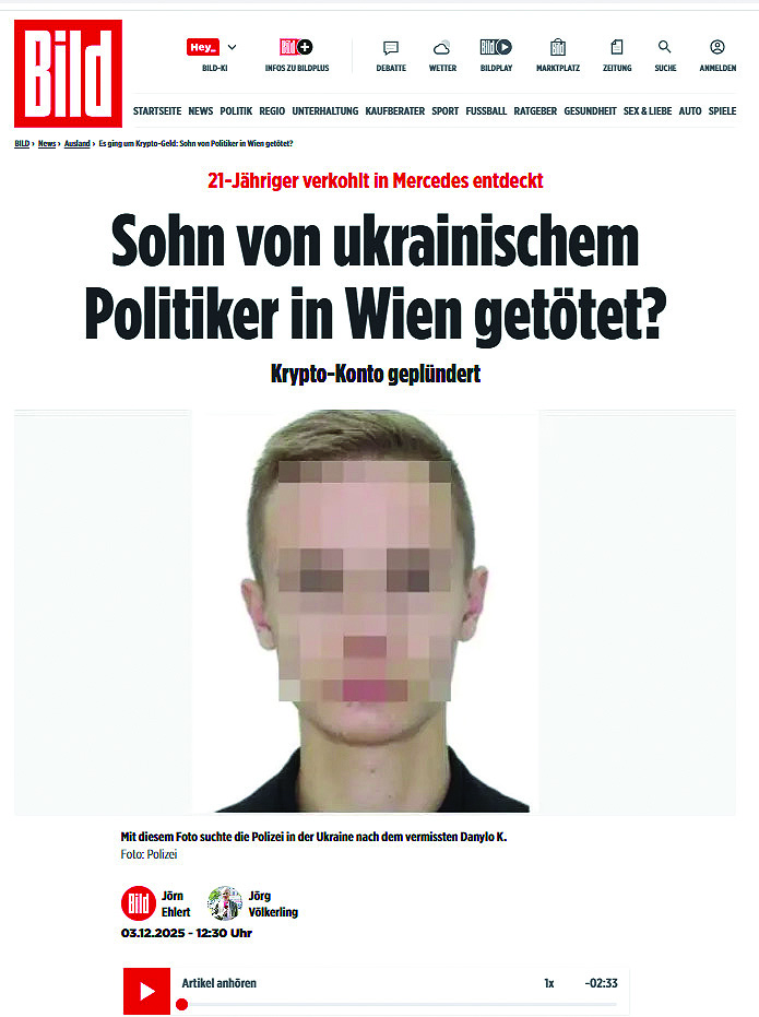 Британският таблоид The Sun също отразява ужасяващото престъпление във Виена. Изданието акцентира на жестокостта и дързостта, с които е извършено ликвидирането на младия украински студент, притежаващ 200 000 долара в криптовалута. The Sun припомня, че тежкият криминален случай идва по-малко от месец след друг подобен – убийството на руснаците Анна и Роман Новак, които бяха открити мъртви в пустиня в Дубай. Двойката потъна вдън земя през октомври и основна версия за изчезването бе, че някой се е опитал да отмъкне богатството им, възлизащо на над 380 милиона паунда.