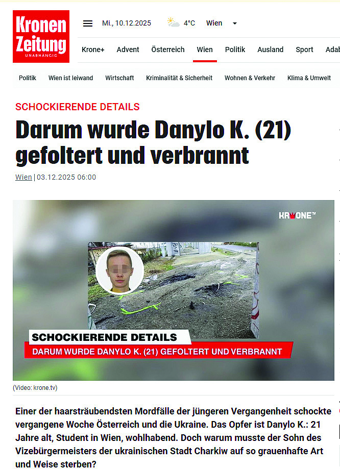 Най-големият австрийски всекидневен вестник Kronen Zeitung отразява убийството на украинския студент Данило Кузмин като един от най-шокиращите криминални случаи в Австрия през последните десетилетия, акцентирайки върху жестокостта на престъплението и финансовия мотив, свързан с криптовалута.