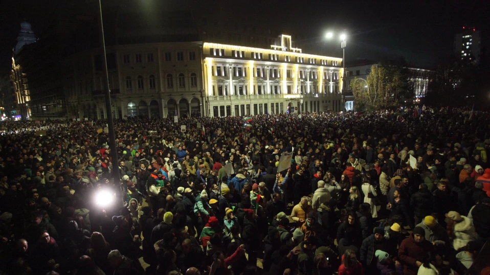 Протестът протича мирно. От сцената на площада звучат музика и скандирания „Оставка“, докато множеството продължава да изразява недоволството си.