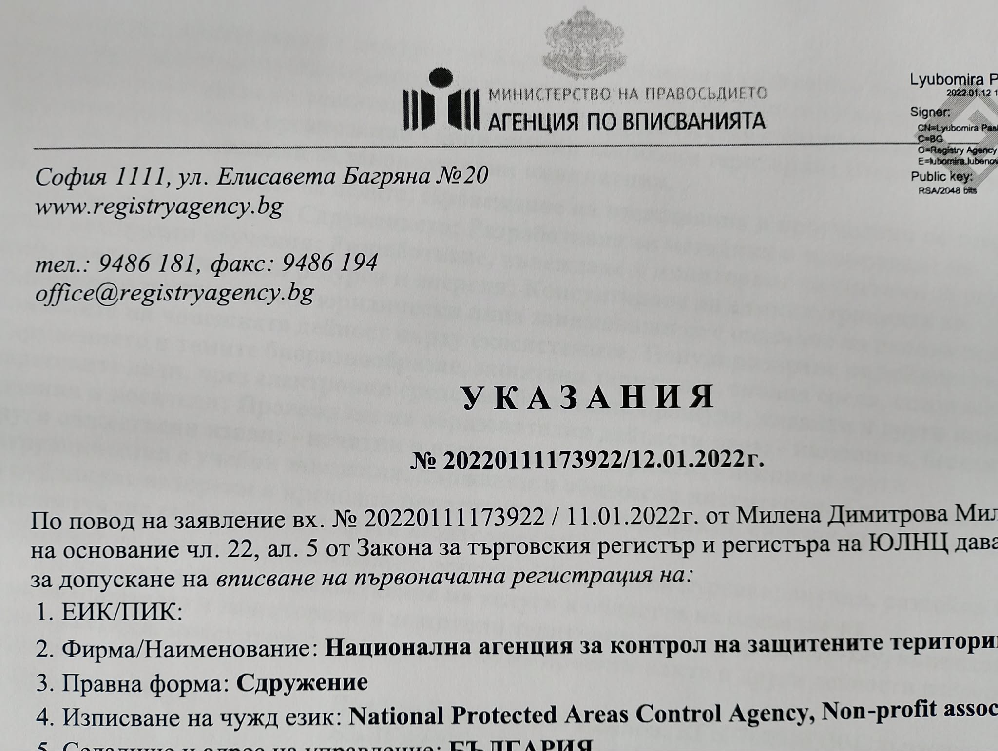 На 12. 01.2022 г. длъжностно лице на име Любомира (отново посочвамe малкото име на лицето с оглед спазване на Закона за защита на личните данни) е издало Указания от Агенцията по вписванията с номер: 202220222273922/12.012022 и по повод на заявление вх. № 20220111173922 / 11.01.2022г. от Милена ...... на основание чл. 22, ал. 5 от Закона за търговския регистър и регистъра на ЮЛНЦ дава указания за допускане на вписване на първоначална регистрация на: