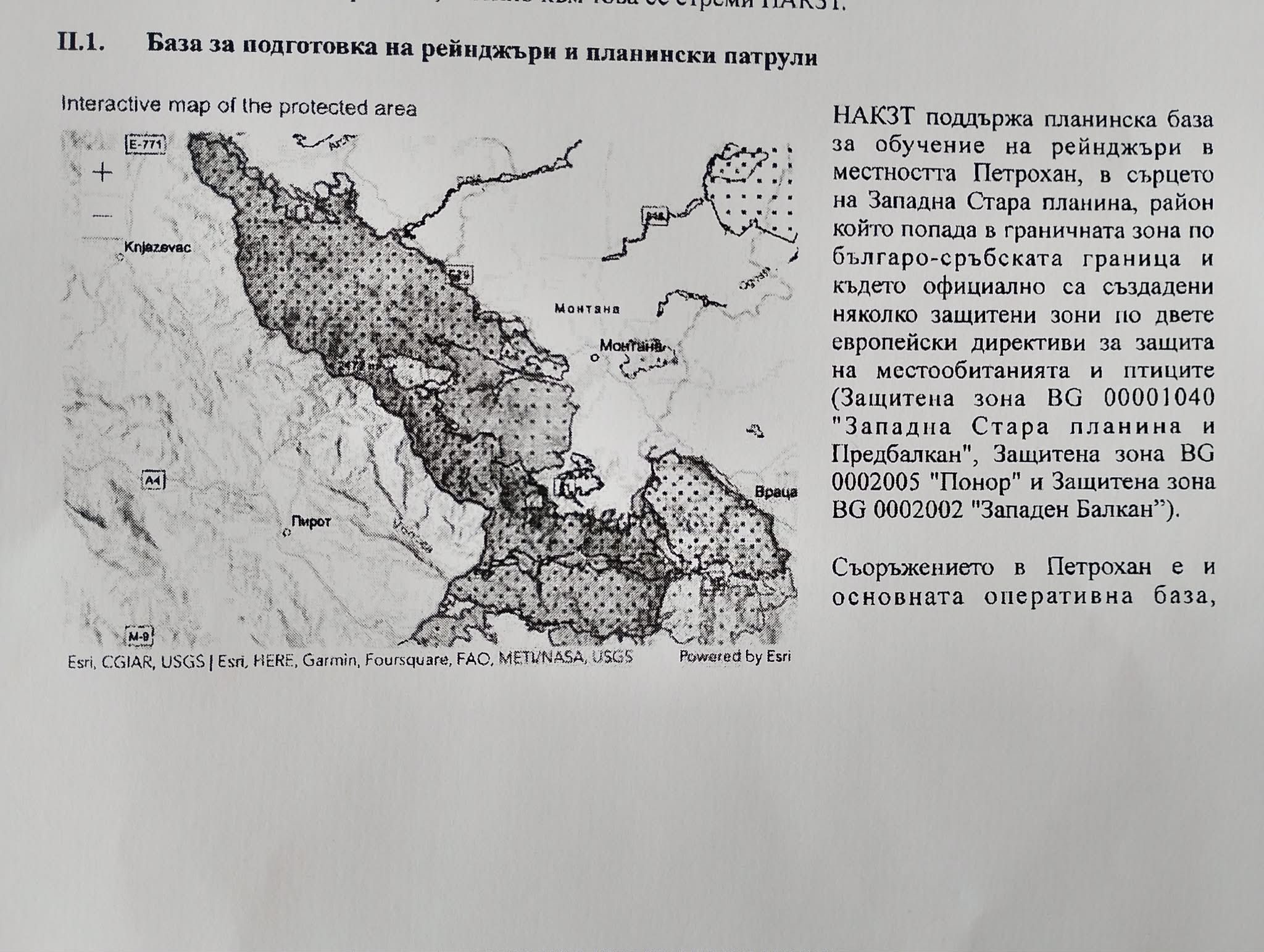 "НАКЗТ поддържа планинска база за обучение на рейнджъри в местността Петрохан, в сърцето на Западна Стара планина, район който попада в граничната зона по българо-сръбската граница и където официално са създадени няколко защитени зони по двете европейски директиви за защита на местообитанията и птиците (Защитена зона BG 00001040№ "Западна Стара планина и Предбалкан", Защитена зона BG 0002005 "Понор" и защитена зона BG 000202 "Западен Балкан".
