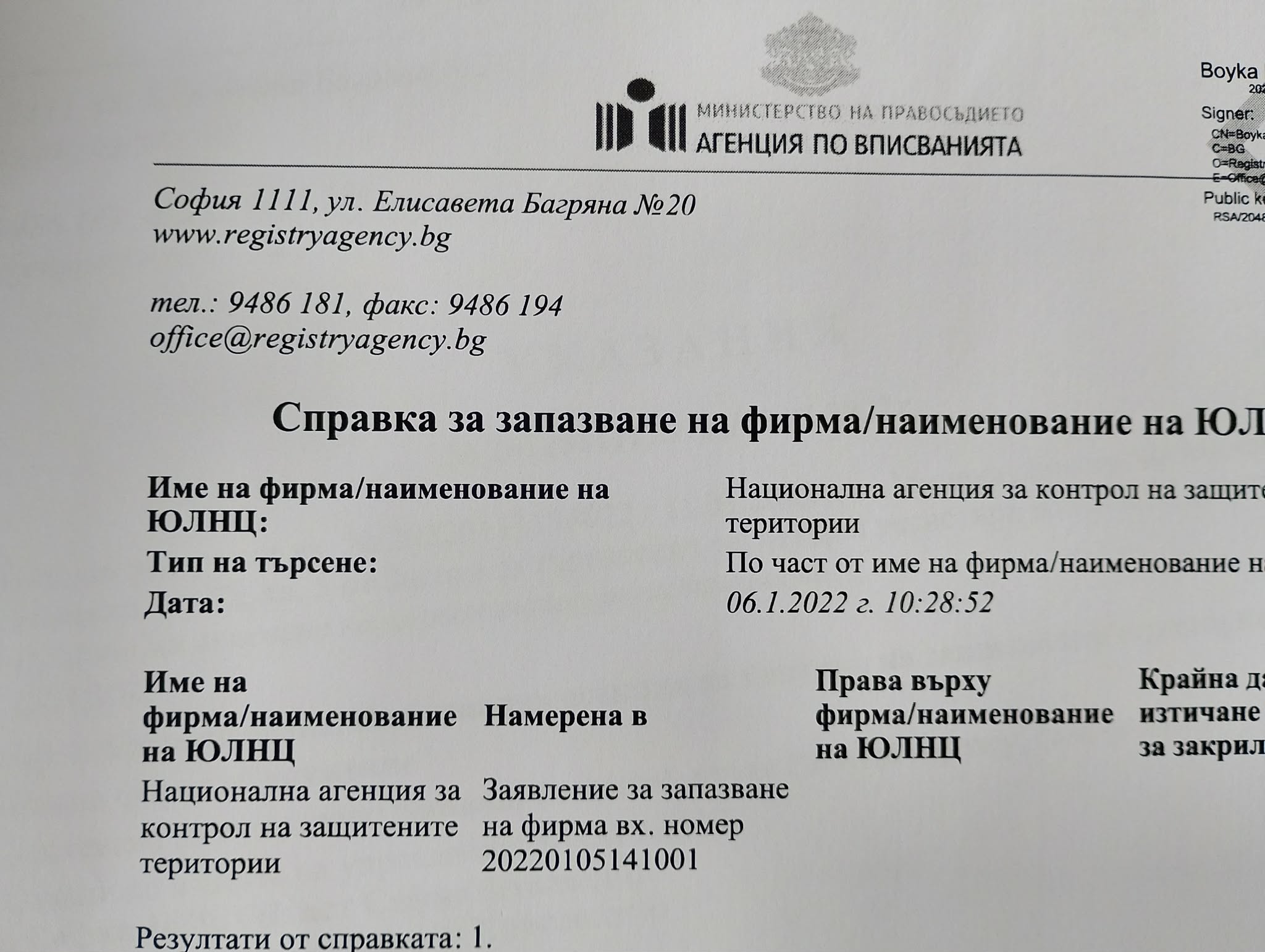 На 06.01.2022 г. в 10:29 ч. длъжностно лице с име Бойка (посочвамe малкото име на лицето с оглед спазване на Закона за защита на личните данни) е удостоверило запазване на наименованието на сдружението "Национална Агенция за Контрол на Защитените Територии". Казано на разбираем език, длъжностното лице Бойка е проверило документите, които съпътстват производството по запазване на име на фирма и го е запазила. Заявлението за запазване на фирма вх. номер е 20220105141001.
