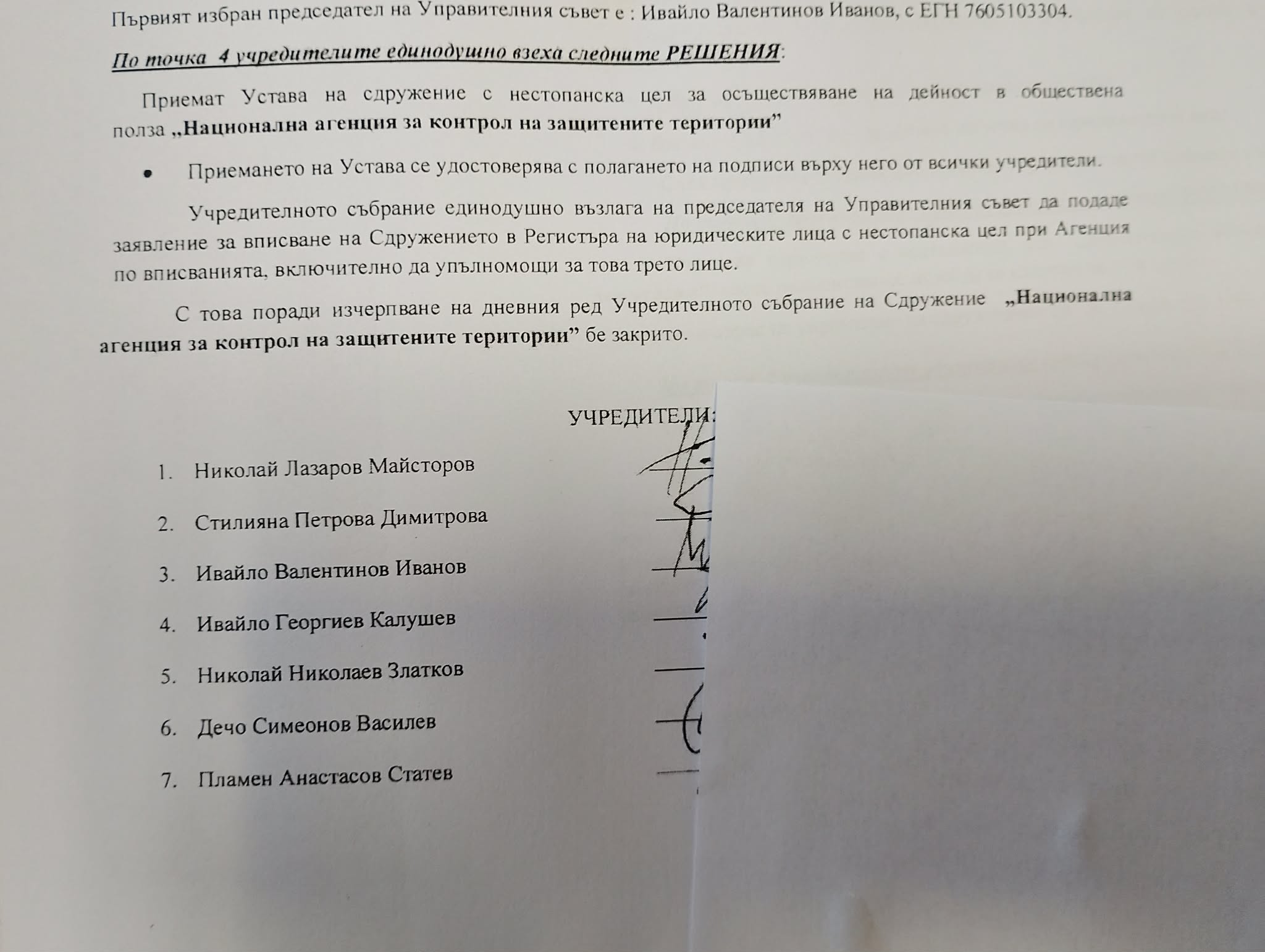 "Труд news" разполага със Справка за запазване на фирма/наименование на ЮЛНЦ, Протокол от учредителното събрание на Сдружението с нестопанска цел "Национална агенция за контрол на защитените територии", Устава на сдружението, Указанията от Агенцията по вписванията и други.