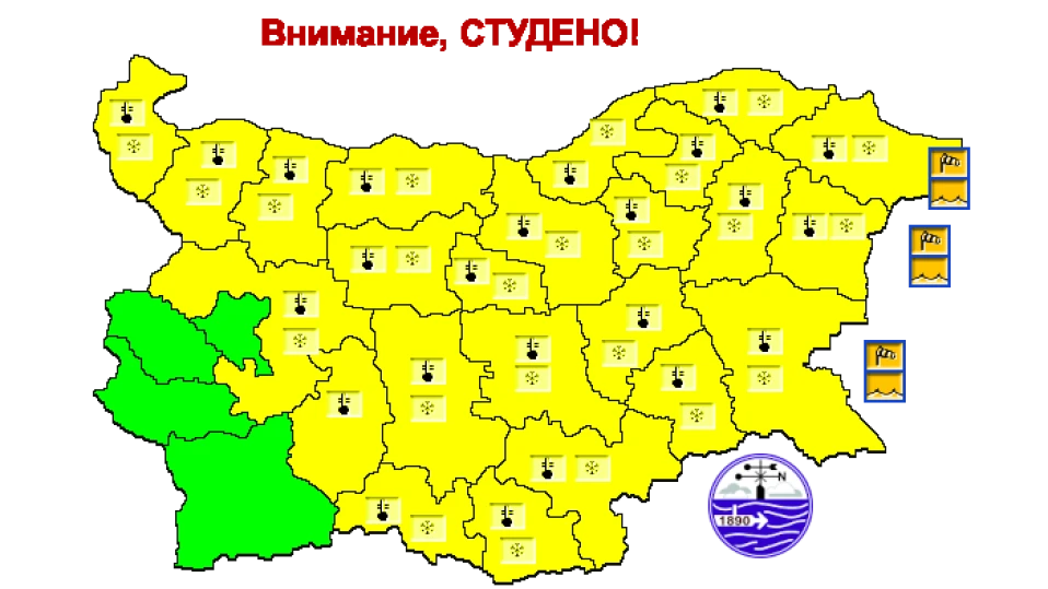 Предупреждението е за дневни температури под нулата и значителни снеговалежи. То е в сила за почти всички области в страната, без София град, Перник, Кюстендил и Благоевград.