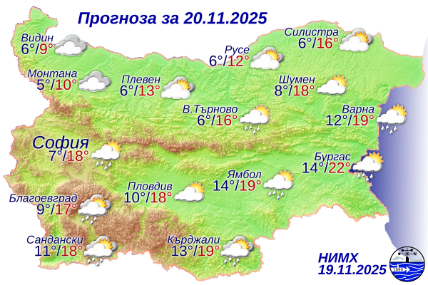 Максималните ще са предимно между 10° и 15°, в Южна България и местата чувствителни на южния вятър до около 20°-22°.