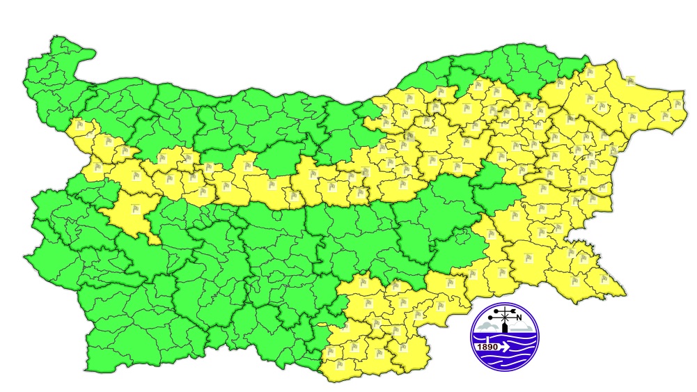 Предупреждението е в сила за областите: Русе, Добрич, Варна, Бургас, Ямбол, Хасково, Кърджали, Шумен, Разград, Търговище, Велико Търново, Габрово, Ловеч, Враца, Монтана, София област и София град.