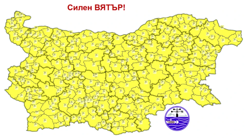 Жълт код за силен вятър за 30 декември за всички 28 области у нас. Такова предупреждение издаде Националният институт по метеорология и хидрология.