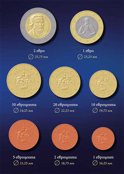 Монетите от 1 до 50 евроцента, изобразяват емблематичния Мадарски конник, включен в Списъка на световното културно наследство на ЮНЕСКО. Символът е представен в стилизирана форма, а около него присъстват изписани на кирилица „БЪЛГАРИЯ“ и „стотинки“. Монетите се отличават и с различни цветове и размери, съобразени с общоевропейските стандарти – биметални за 1 и 2 евро, златисти за 50, 20 и 10 евроцента и медни за най-ниските номинали. Размерите варират от 25,75 мм за монетата от 2 евро до 16,25 мм за 1 евроцент, което улеснява разпознаването им при ежедневна употреба.