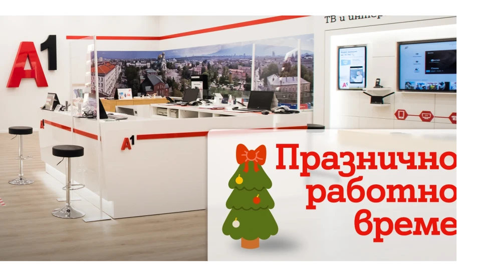 Видео магазинът на А1 също ще работи с променено работно време през празничните дни. Той ще бъде затворен на 25 декември, 1 и 2 януари, а на 31 декември ще бъде на разположение от 10:00 до 15:00 часа за клиентите, които искат да се свържат с търговски консултант с видео връзка. Във всички останали дни магазинът ще работи със стандартно работно време.