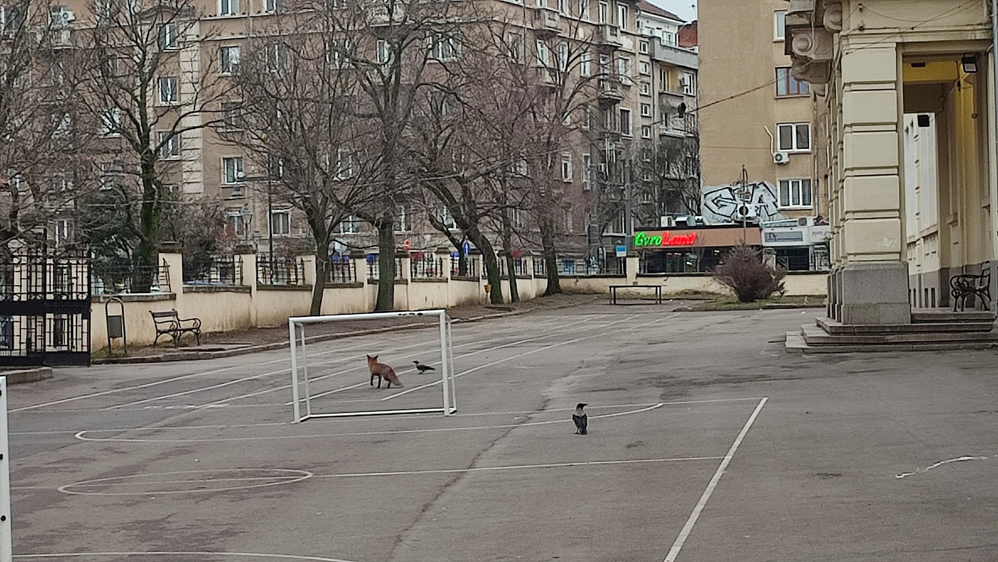 Досущ като в българската народна приказка "Врана и лисана" Кума Лиса навести столично училище и се заигра с две врани в двора на школото.