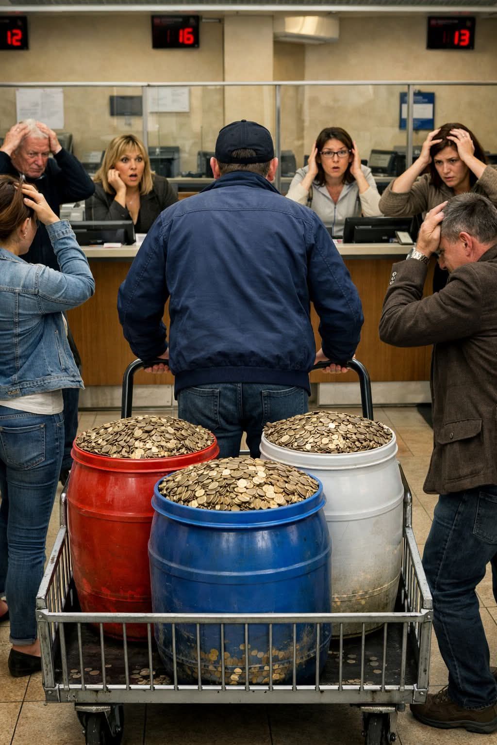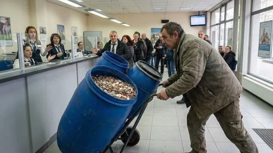 Снимка на мъж в работно облекло, който таман слязъл от строежа директно нахлува в банка, за да обмени три бидона с монети, циркулира от ден-два в социалните мрежи. Някои медии дори пробутаха този нескопосан монтаж за реална случка, съответно за репортаж и новина.