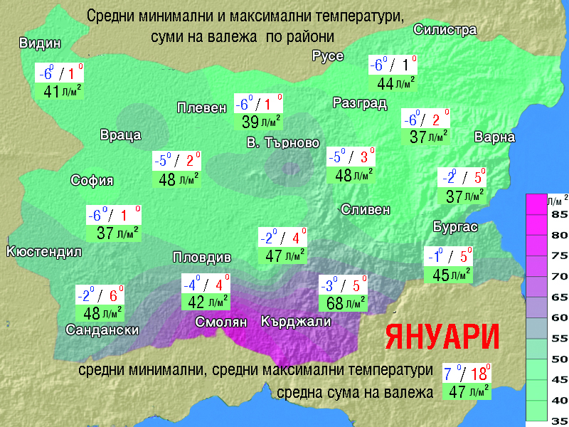 През третата десетдневка - от 20 до 24 януари се очаква сухо време, чести мъгли в ниските места и слънце в планините. От 25 до 29 януари предстои период с валежи от сняг и чувствително застудяване. По-интензивни ще бъдат снеговалежите около 26 до 27 януари. В Добруджа се очакват и виелици с навявания. Дневните температури в традиционно топлите места ще достигат едва 1,2 градуса. От 30 януари ще се затопли слабо, без валежи.