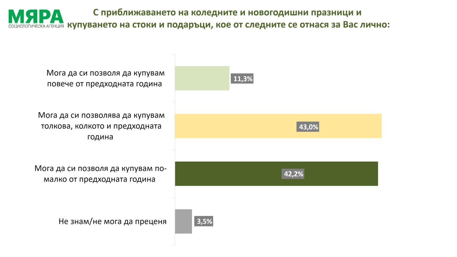 Неприемането на нов бюджет ще се отрази реално на жизнения стандарт на българите, признават 63,8% от запитаните. На обратното мнение са 31,8%. Има и малка „сива“ зона. Данните идват на фона на по-ниската готовност на българите да купуват за празниците. С наближаването на коледните и новогодишни празници, характерно с очаквано повишено купуване, 43% заявяват, че няма промяна в покупателната им способност спрямо предходната година. 42,2%, обаче отбелязват, че възможността им да купуват стоки и подаръци е намаляла. Малко над една десета оценяват финансовите си възможности около празниците като по-добри спрямо предходната година. Останалите не могат да преценят.