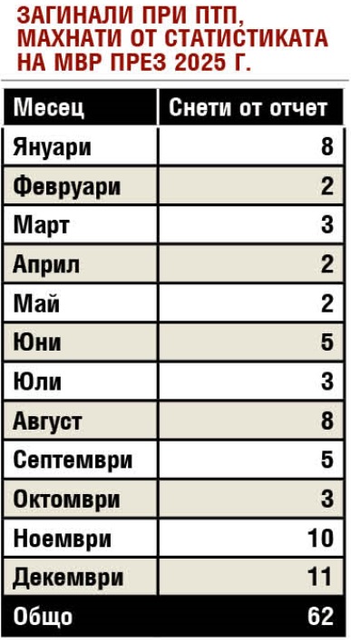 Публикуваната от МВР статистика показва, че през 2025 година от отчет са заличени 62-ма загинали при пътно-транспортни произшествия (ПТП). Това представлява около 12% от всички отчетени 518 загинали през годината. За сравнение - през 2024 година “Пътна полиция” е заличила от статистиката 48 души, или приблизително 9,1% от общо 526 загинали. Данните обявиха вчера от Института по пътна безопасност и според експертите продължават статистическите манипулации, измами и демагогия, за да се прикрие истината за риска да загинеш при катастрофа в България.