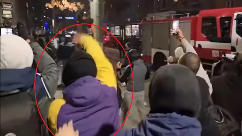 В множеството полицаите забелязват двама младежи с изключително агресивно поведение. Единият от тях е облечен с яке с жълти ръкави и лилав гръб, с поставена маска на лицето, която от време на време сваля, а другият - с черни дрехи и черна качулка.
