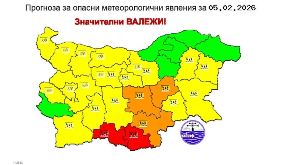 Червен код за очаквани значителни валежи (над 65 mm) е в сила за южната част от областите Смолян и Кърджали, оранжев код за значителни валежи (до 65 mm) в областите Хасково, Сливен и Стара Загора, жълт код за значителни валежи (до 35 mm) за областите Благоевград, Пазарджик, Пловдив, Ямбол, Бургас, Варна, Шумен, Габрово и за южните общини в области Ловеч и Велико Търново.