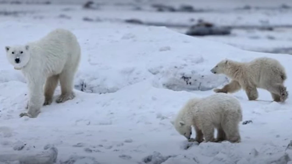 Петгодишната майка мечка и нейните 10-11-месечни малки бяха наблюдавани и заснети на камера по време на ежегодната миграция на полярните мечки по западното крайбрежие на Хъдсън Бей, близо до Чърчил, Манитоба, град, известен с популацията си от полярни мечки.