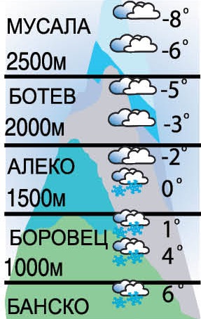 Максимални температури за деня - над 2500 /метра/ височина - около -5 до -2 градуса, а на 1500