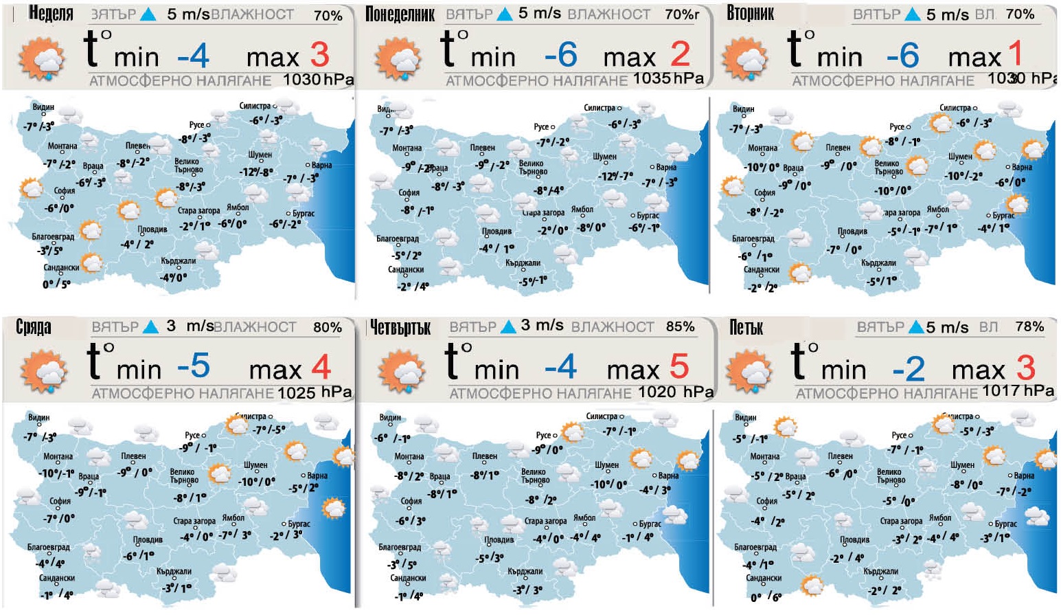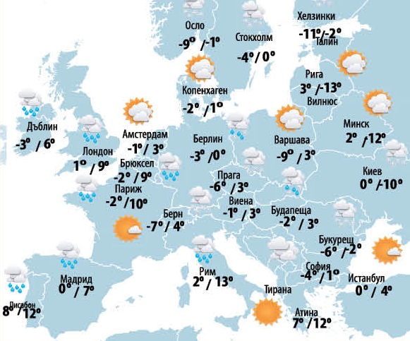 По Черноморското ни крайбрежие ще се стелят нискиоблаци и мъгли. На запад мъглите бързо ще се вдигат до предимно слънчево. Вятър – слаб, /скорости до 20 километра в час/, от югозапад. По високите части на планините ще духат умерени до свежи ветрове от югозапад /скорости до 25 километра в час/. Максимални температури на север от 5 до 10 градуса, по Черноморието дневни температури до 9 градуса . За района на За София - минимална температура около -1, 0 градуса, и максимална до 8, 9 градуса.