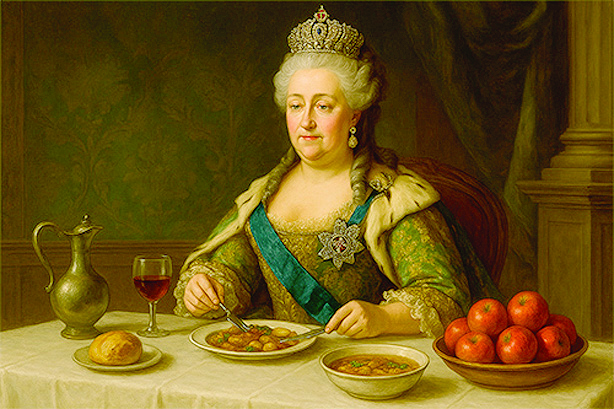 И да, нека си го кажем, руската императрицата се слави с ненаситния си апетит - наред с прости, непретенциозни ястия, тя се наслаждава на всякакви деликатеси. Ето например списък с ястия в едно от храненията на Екатерина II: “Пуйка с шио, терини с крилца и зелено пюре, патица със сос, мариновано пиле, костур с шунка, пулардес с трюфели, лешник по испански, костенурки, чириата с маслини, компиенска тортила, дванадесет салати, седем соса и тарталети.”