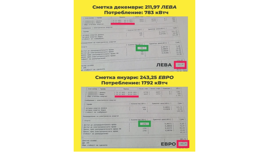 В една от групите във Фейсбук е показана сметка за ток за декември и за януари. Според отчетените данни двучленно семейство е трябвало да плати през декември за потребление на 783 кВтч, а през януари за 1792 кВтч или с 1009 кВтч повече, което е увеличение със 124%.