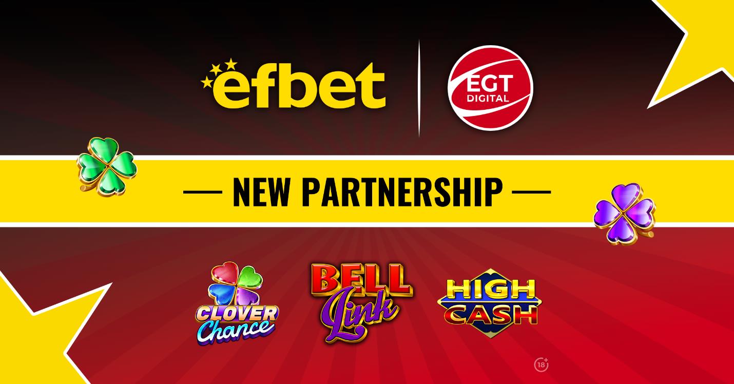 Преследвайки тази цел, от компанията продължават изключително успешното си партньорство с EGT Digital - доставчик на игри, предлагащ иновативен поглед върху игралната индустрия. В последните седмици присъствието на разработчика се засили в платформата на efbet, като бяха добавени редица нови джакпоти, сред които са “Clover Chance“, “Bell Link“, “High Cash“, както и мултиплейър играта “xRide“.