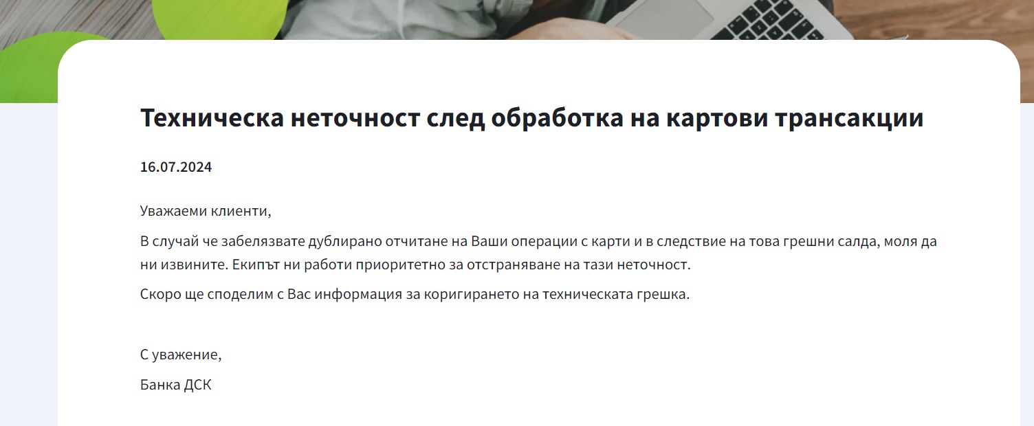 "Уважаеми клиенти, В случай че забелязвате дублирано отчитане на Ваши операции с карти и в следствие на това грешни салда, моля да ни извините. Екипът ни работи приоритетно за отстраняване на тази неточност.