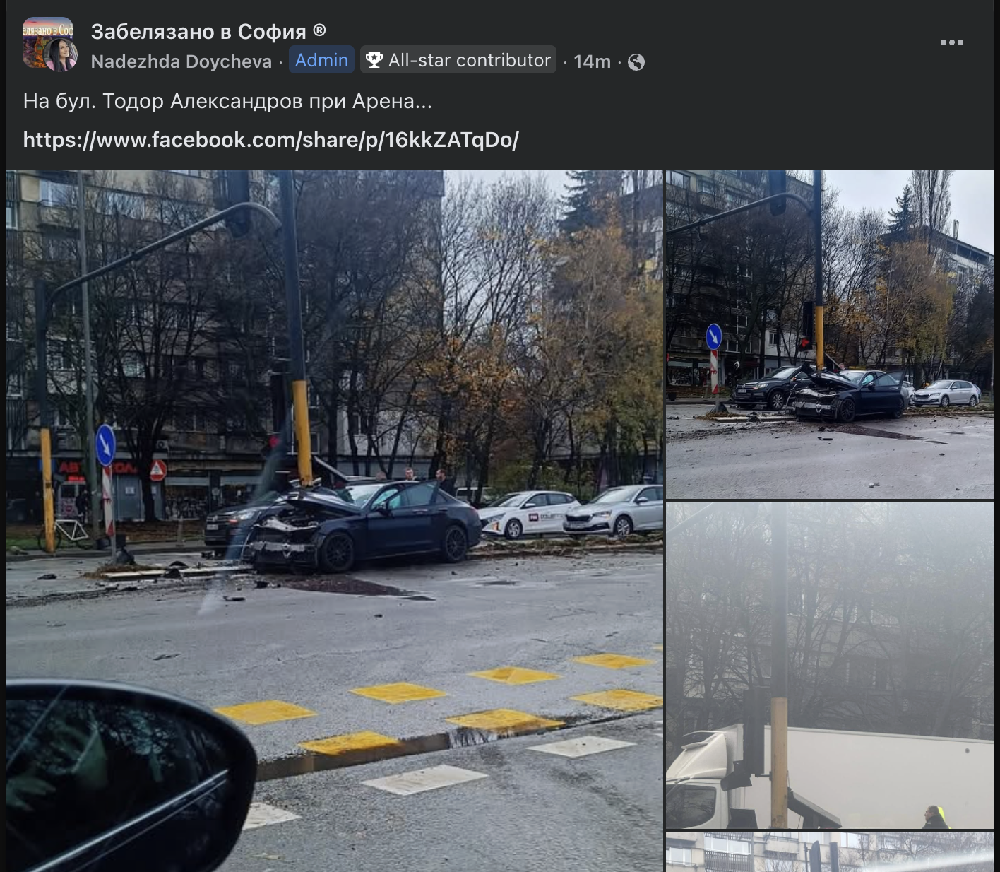 Автомобил се е ударил в стълба на светофар на булевард "Тодор Александров", съобщава очевидец във Facebook групата "Катастрофи в София".