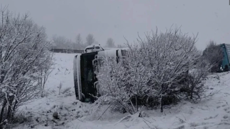 В района на Видин тир се е обърнал на пътя, а друг камион е аварирал в канавката, показват кадри, споделени в социалните мрежи.