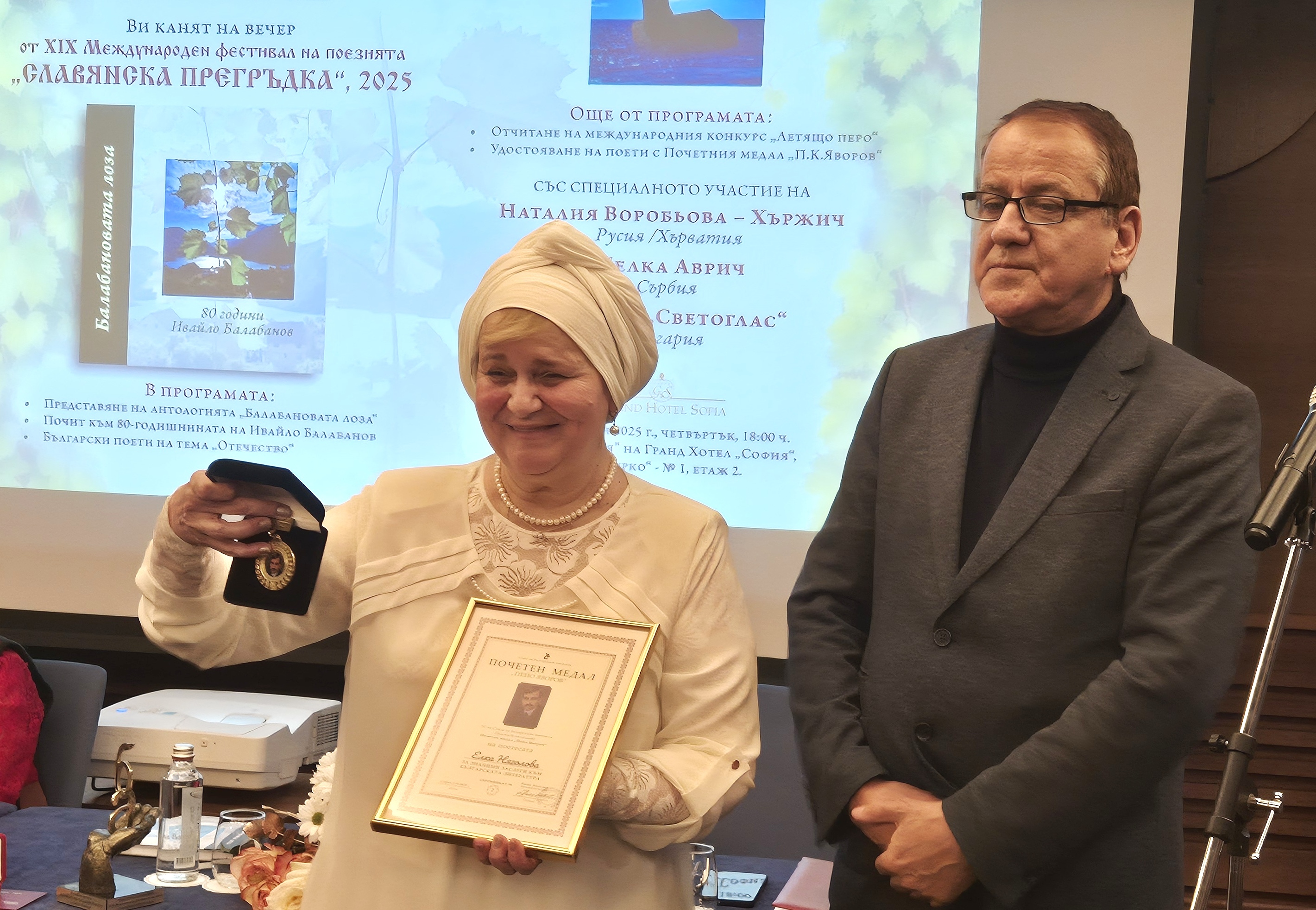Същия ден в Гранд хотел „София“ се състоя 3-часов поетичен маратон. Във фокуса на програмата беше премиерата на луксозната антология „Балабанова лоза“ (2025), посветена на Ивайло Балабанов – любим поет на няколко поколения читатели, чиято 80-годишнина беше отбелязана през август т.г. Перфектният дизайн на изискания том с твърди корици е дело на Валерий Пощаров, а съдържанието събира в едно 39 незабравими творби на Ивайло Балабанов и стихотворения на 62 съвременни поети, които поемат щафетата от него, разлиствайки в клоните на поезията си неговия изпълнен с величие и преклонение наратив за отечеството – родната земя, татковината – онази дума, която е не само съкровена, но и туптяща с кръвта и сълзите, попили в тракийската земя, която той приласкаваше и обожаваше...