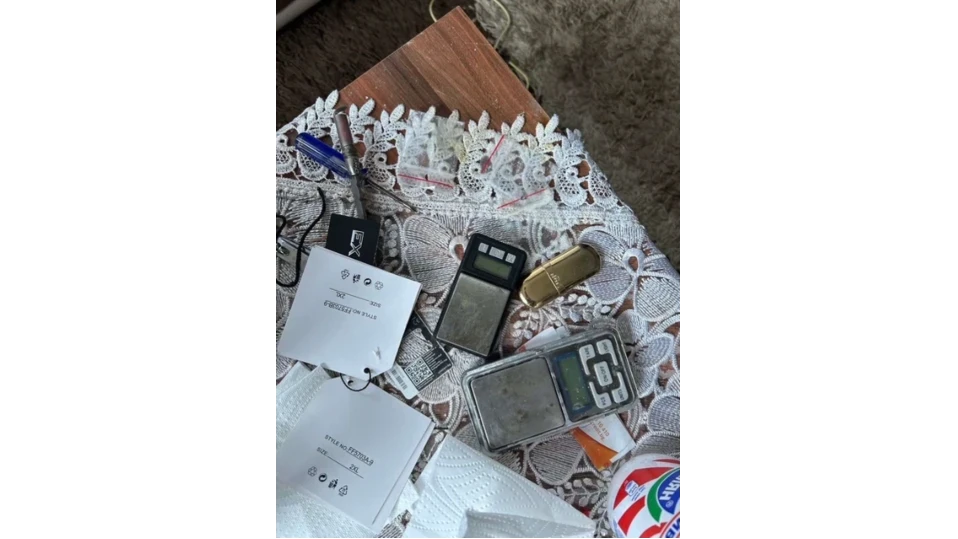 Иззети са още две електронни везни и плик с бяло прахообразно вещество с тегло около 100 грама.
