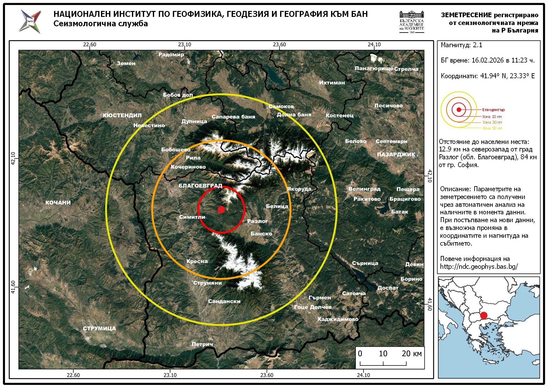 Плитко земетресение с магнитуд 2,1 по скалата на Рихтер е регистрирано в България днес, 16 февруари 2026 г. (понеделник), точно в 11:23 ч.