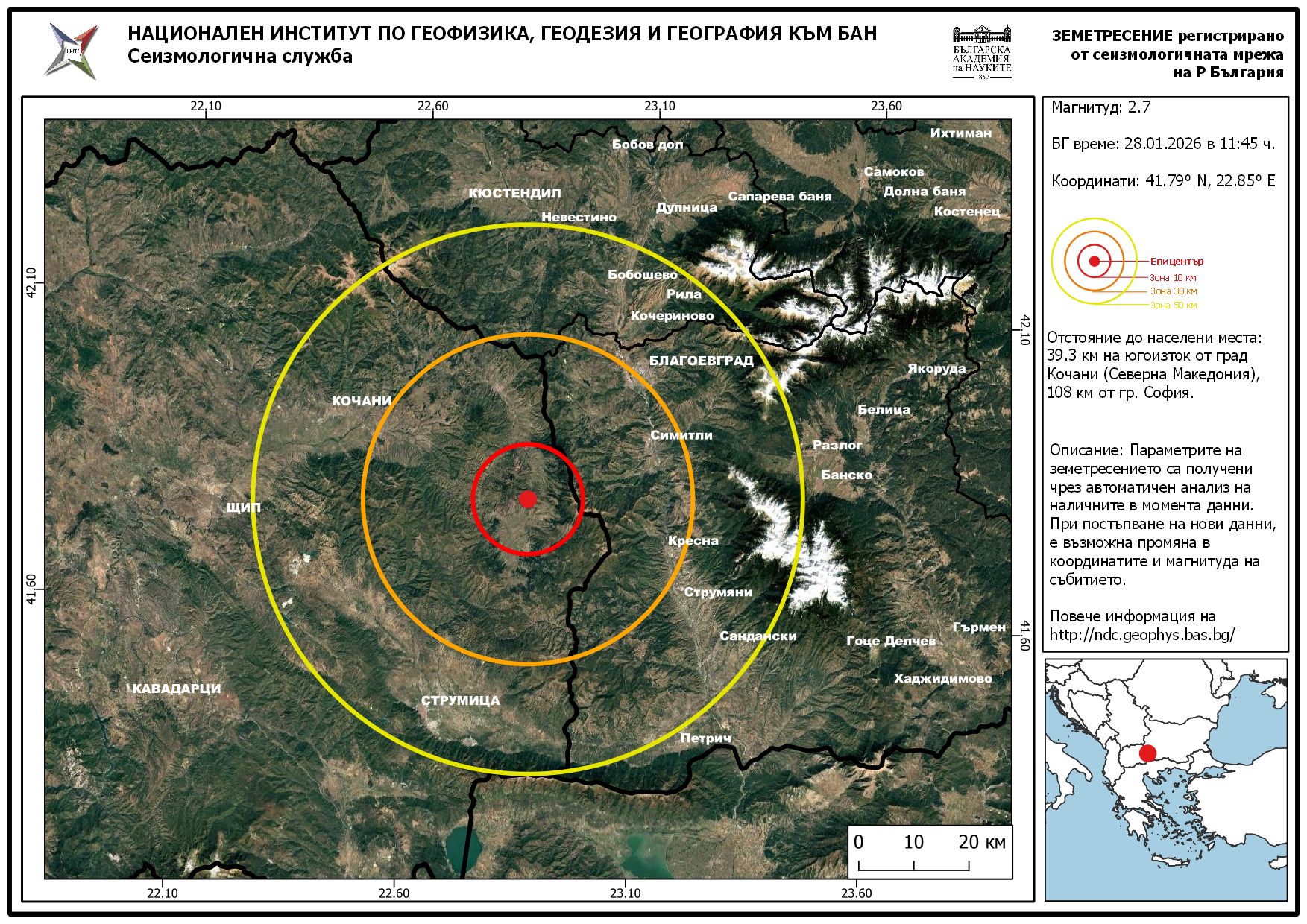 Земетресение с магнитуд 2,7 по скалата на Рихтер е регистрирано днес, 28 януари 2026 г., в 11:45 в Република Северна Македония на 39.3 км на югоизток от град Кочани.