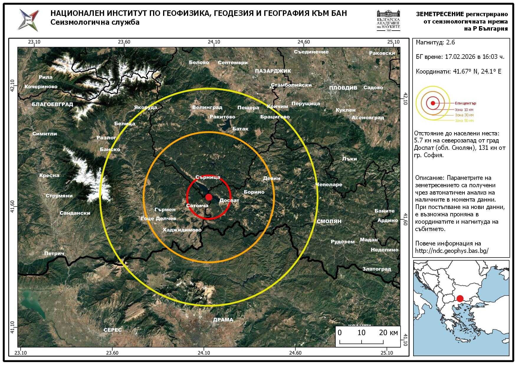 Земетресение с магнитуд 2.6 по скалата на Рихтер е регистрирано на територията на България днес, 17 февруари 2026 г., в 16:03 ч.