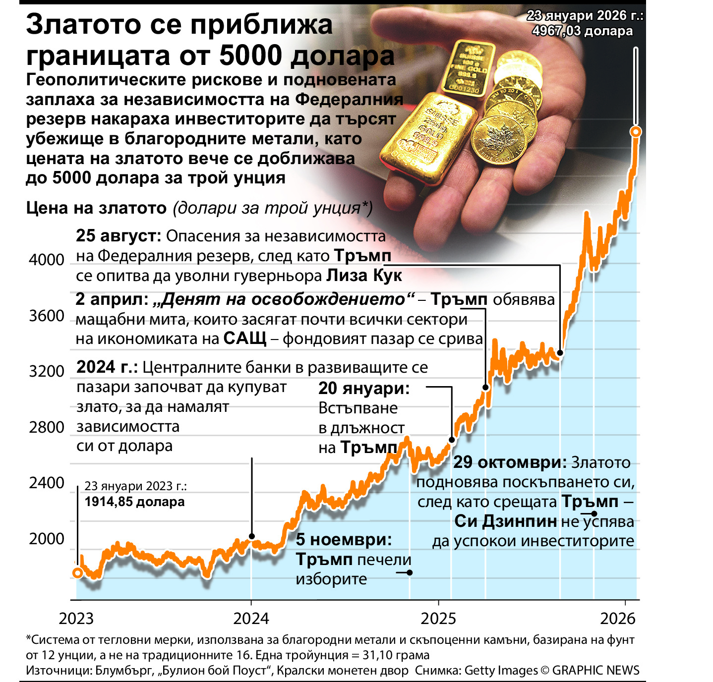 С падането на щатския долар поради нови заплахи за налагане на тарифи на Европа и последиците от исканията за Гренландия, доверието в американските активи е на ниско ниво. Очаква се Федералният резерв на САЩ да задържи лихвите до края на месеца, но се очакват поне още две намаления до края на годината, особено след като опитът на президента Тръмп да свали председателя Джером Пауъл заплаши независимостта на Федералния резерв.