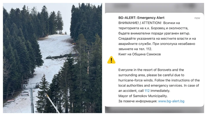 Ураганен вятър събори дървета в Боровец, активираха BG Alert Кметът Самоков Ангел Джоргов разпореди активирането на системата BG Alert. На мобилните устройства н... София Област 15:34 04.01.2026