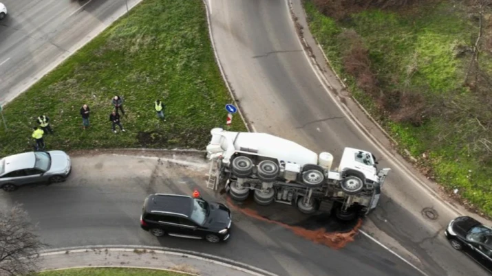 Бетоновоз се обърна близо до ключов булевард в София (СНИМКИ) Бетоновоз се е обърнал на отбивката за качване на бул. "Цариградско шосе" в посока "Телевизионната к... София 10:10 06.01.2026