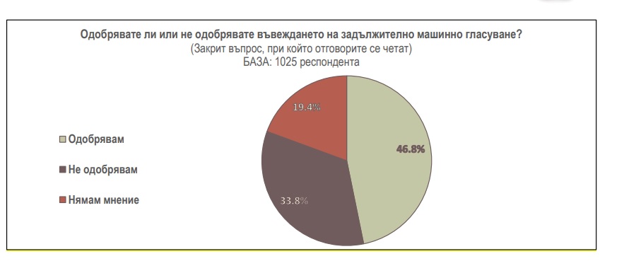 46.8% от българите одобряват въвеждането на задължително машинно гласуване. На него се гледа като на една от мерките, които гарантират честността на вота. Тази позиция се споделя по-често от мъже, от хора на възраст до 40 години, от високообразовани и заможни респонденти, както и от жители на градовете-областни центрове. Най-много поддръжници на задължителното гласуване има сред избирателите на коалицията Изправи се! Мутри вън! (73%), на ИТН (71%) и на Демократична България (55%). Сред избирателите на ГЕРБ-СДС неодобряващите задължителното машинно гласуване имат значим превес над одобряващите тази промяна (50% : 36%). Близо половината (48%) от хората на възраст над 60 години не одобряват задължителното машинно гласуване. Като цяло малко над една трета (33.8%) от всички интервюирани са против тази промяна в изборите правила, а близо една пета от българите (19.4%) нямат мнение по въпроса.