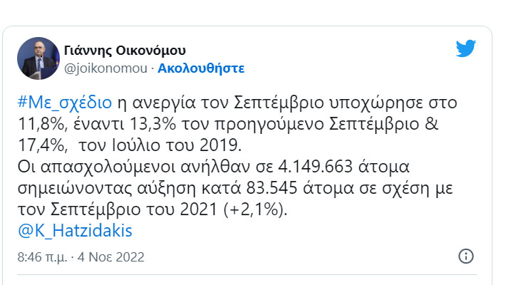 „Безработицата през септември спадна до 11,8%, в сравнение с 13,3% през предходния септември и 17,4% през юли 2019 г. Заетите възлизат на 4 149 663 души, отбелязвайки увеличение от 83 545 души в сравнение със септември 2021 г. (+2,1%)“, пише Янис Иконому.