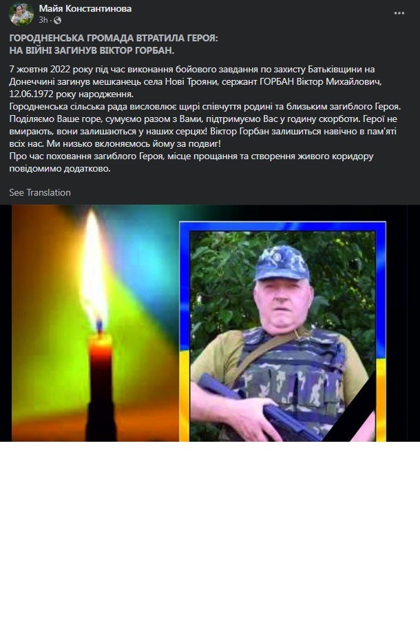 Сержант Виктор Горбан, родом от българското село Нови Троян, е бил убит по време на изпълнение на бойна задача.