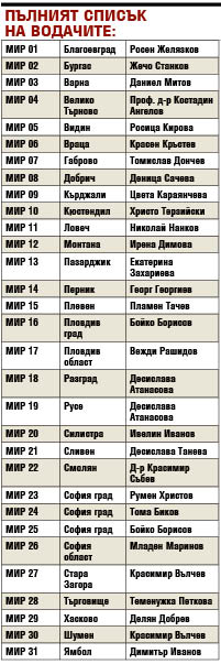Водачите се запазват в Бургас - Жечо Станков, в Благоевград - Росен Желязков, във Видин - Росица Кирова, Монтана - Ирена Димова, в Плевен - Пламен Тачев, в Смолян - д-р Красимир Събев, в Силистра -Ивелин Иванов и в Ямбол - Димитър Иванов.